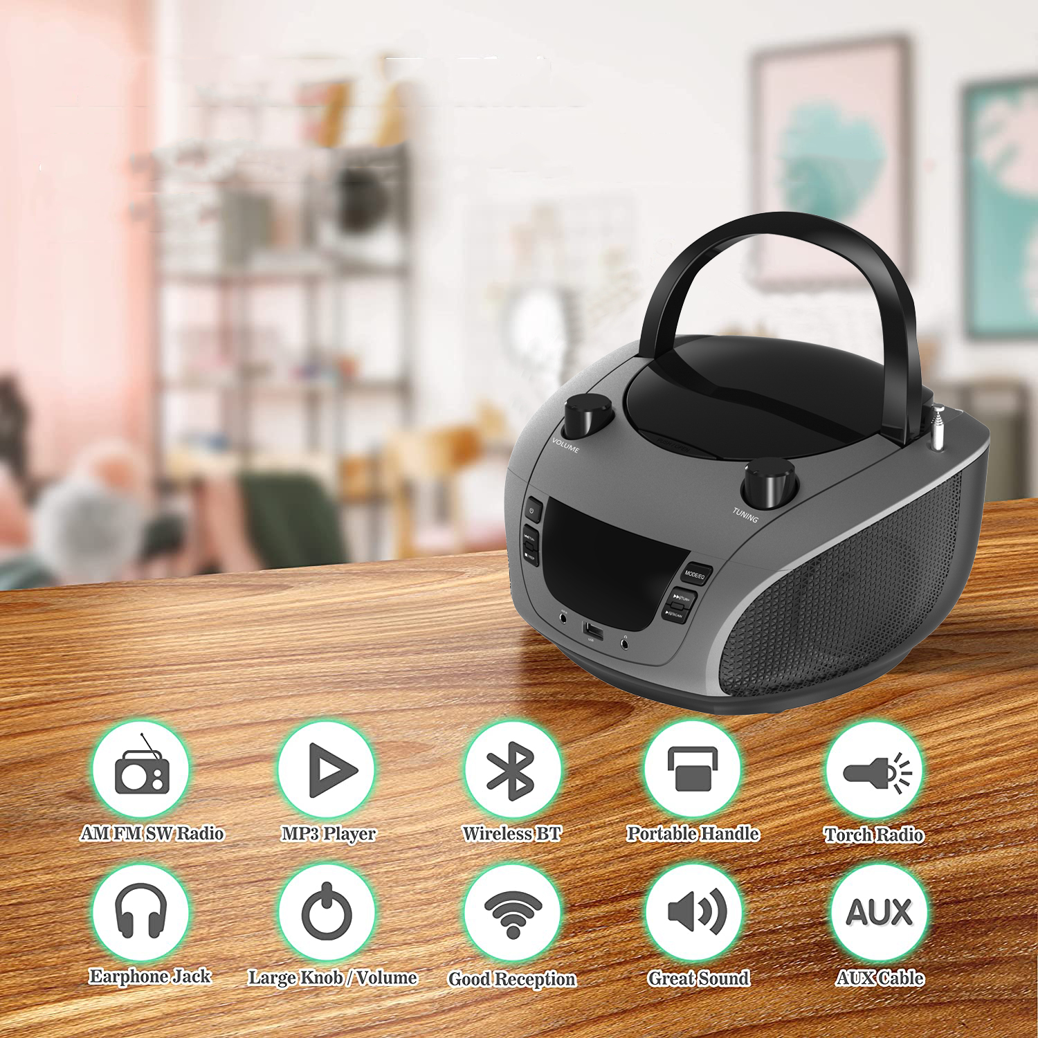 CD Player, Bluetooth, USB, MP3, AUX, FM and AM Radio, Portable, Built-in Stereo Speakers, Carrying Handle, LCD Display, Gray